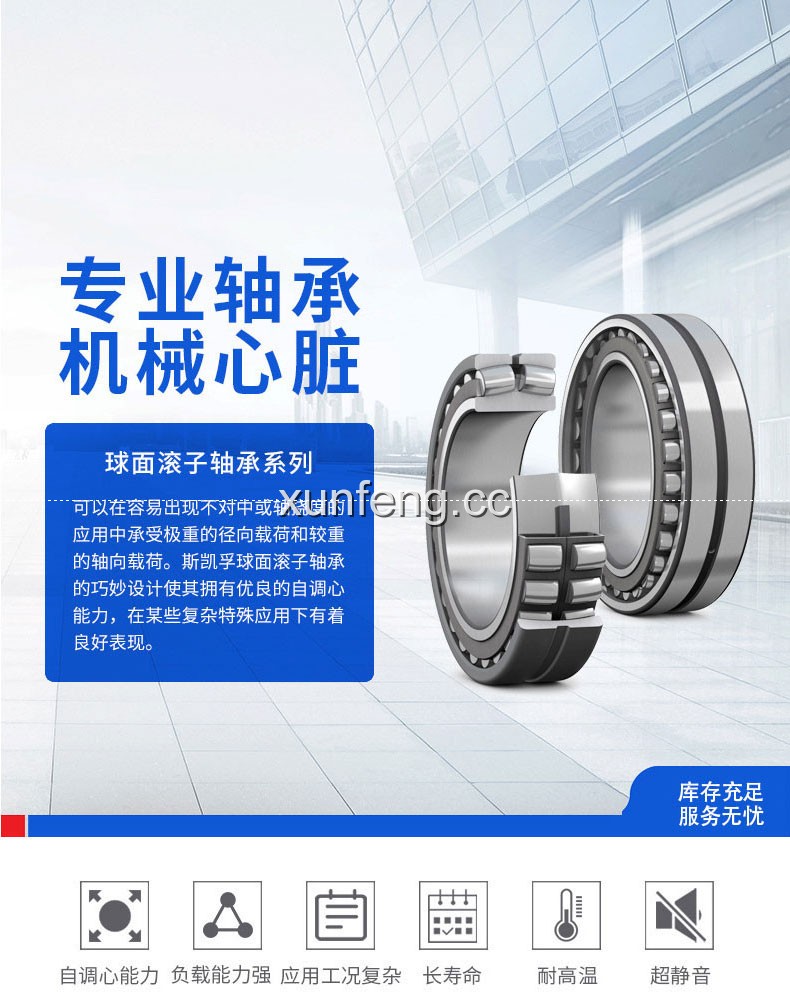 调心滚子轴承具有两列滚子,一个共同的带球面外圈滚道和内圈滚道在轴承轴线成一角度倾斜。在外圈的滚道中的球体的中心点是在轴承轴线。调心滚子轴承设计用于承受重径向载荷,以及在两个方向的轴向载荷重。...
