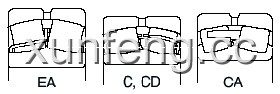 调心滚子轴承,如图所示,有高负荷容量设计的EA型,C型,CD型,CA型。设计上, EA型,C型,CD型 为冲压保持架, CA型为铜合金车制保持架。EA 型轴承具有高负荷容量,低转矩的特长。